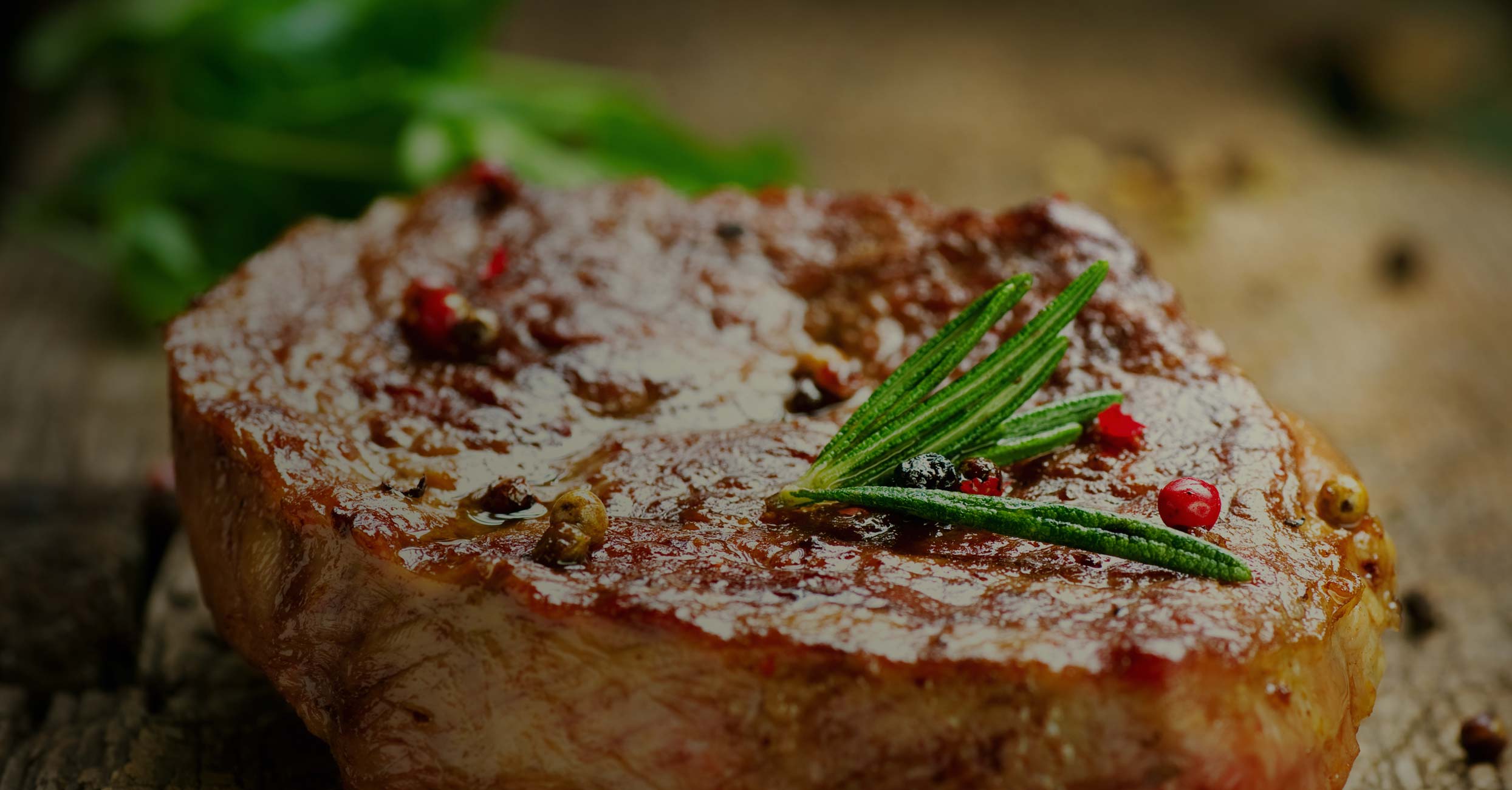 Rumpsteak, Hüftsteak und Rinderfilet mit Speck, Zwiebeln, Paprika und Pommes frites
